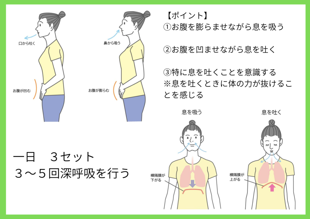 1日3セット、ゆっくりと深呼吸を3~5回。